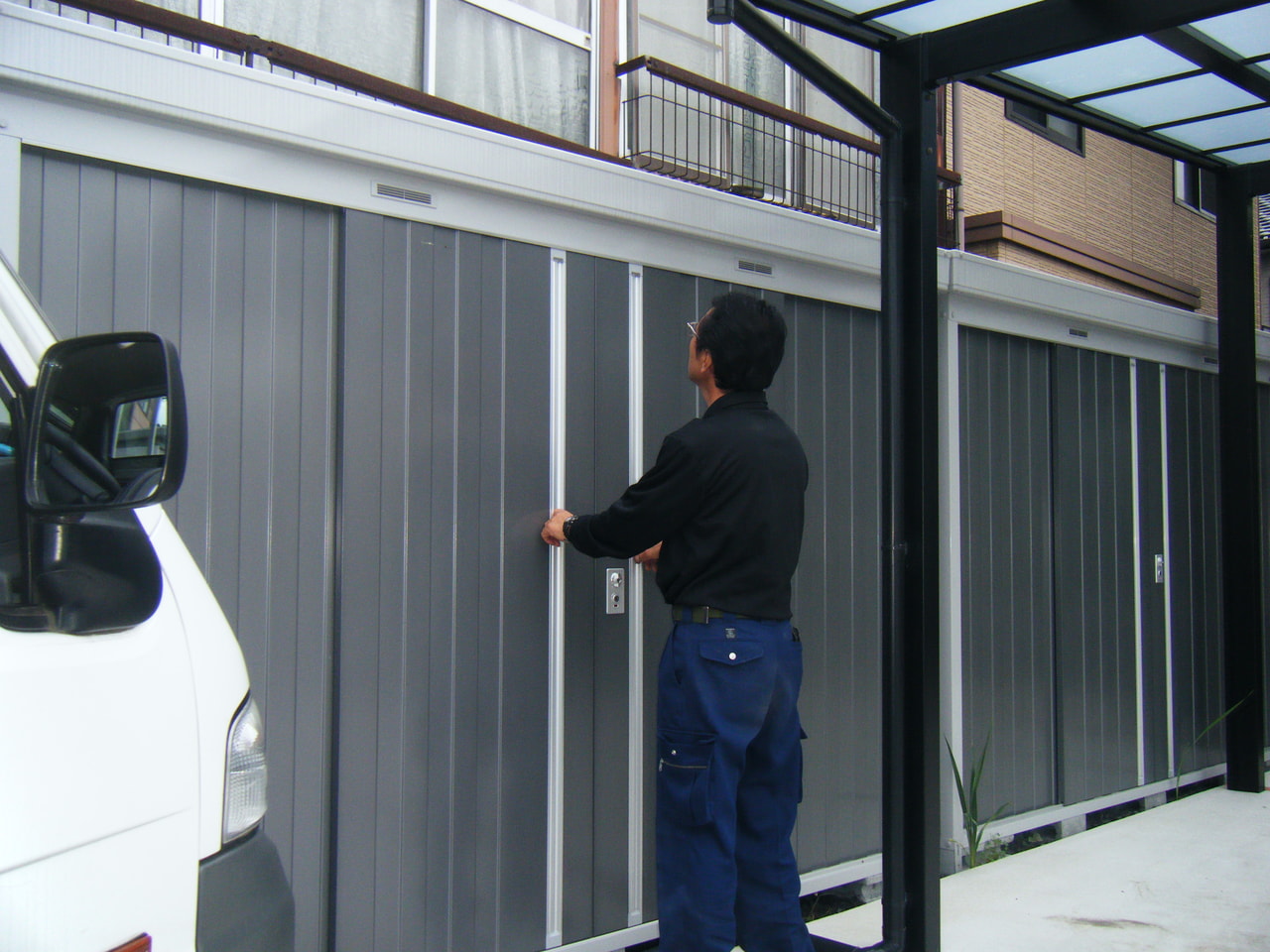 外構フォームの現場です。コンクリートのかけや割れの点検、カーポートのネジの緩み、物置の立て付けなどお点検しました。特に問題はありませんでした。広く便利になって大切に使われております。
