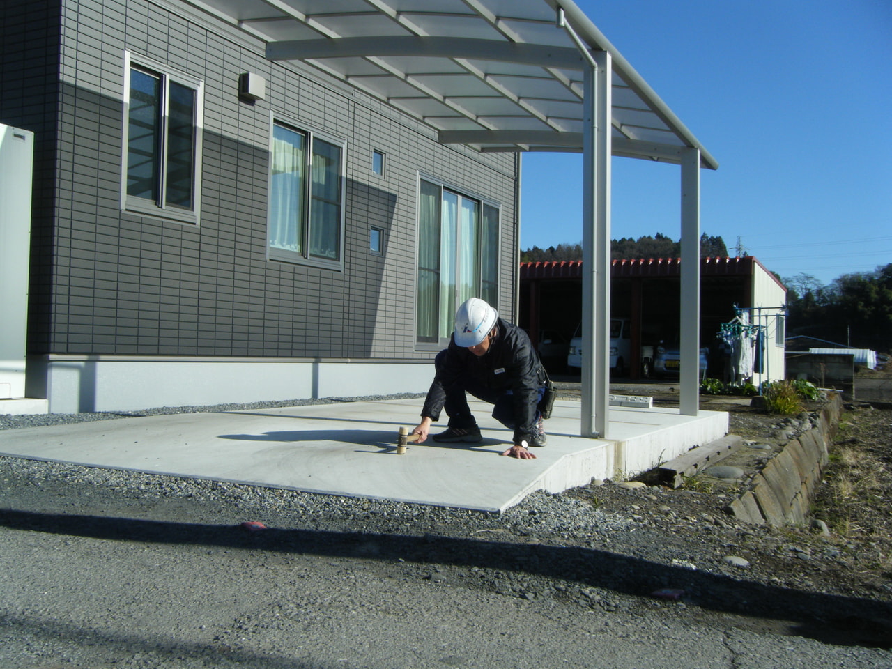宇都宮市K様邸 アフター点検レポート 2017.12.21(最終更新 2019.04.01) 1年点検にお伺いしました。カーポートのネジの緩みや傾きやねじれなどを点検しました。そのほか土間コンクリートの打音点検をしました、特に問題はありませんでした。風当たりが強い場所なのでしっかりコンクリートも打ってあるので安心が感じられました。