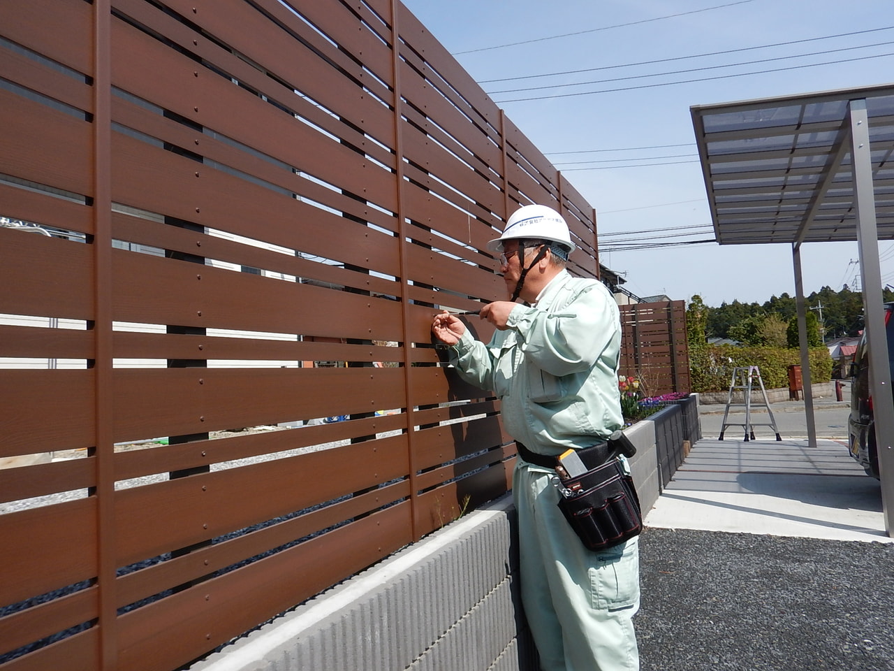 1年点検にお伺いしました。 マイティユニットフェンスやカーポートのネジの緩みや傾きを点検し、ネジの増し締めを行いました。 土間コンクリートやアプローチの打音点検を行い、欠けやヒビ・割れの点検も行いました。 駐車場のインターロッキングの目地を整えるため、珪砂を入れました。 珪砂を入れると見た目も綺麗になりました。 点検中、表でお子様がずっと一緒に付き添って居てくれていました。 笑顔の可愛いお子様でした。