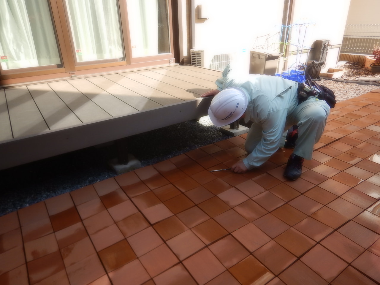 1年点検にお伺いしました。  カーポート・サイクルポート・ウッドデッキ樹ら楽ステージ止めネジの増し締め及び、歪みや変形、また門柱・表札・ポスト・物置の水平垂直度の点検、駐車場・アプローチ・土留め等の打音点検による割れ・ヒビ・欠け等の点検をしましたが、特に問題ありませんでした。 ただ、サイクルポートの雨どいに落葉が詰まって折り、落葉を取除くと溜まっていた雨水がダムの決壊の様に出て来ました。  たまに見て頂けると良いと思います。