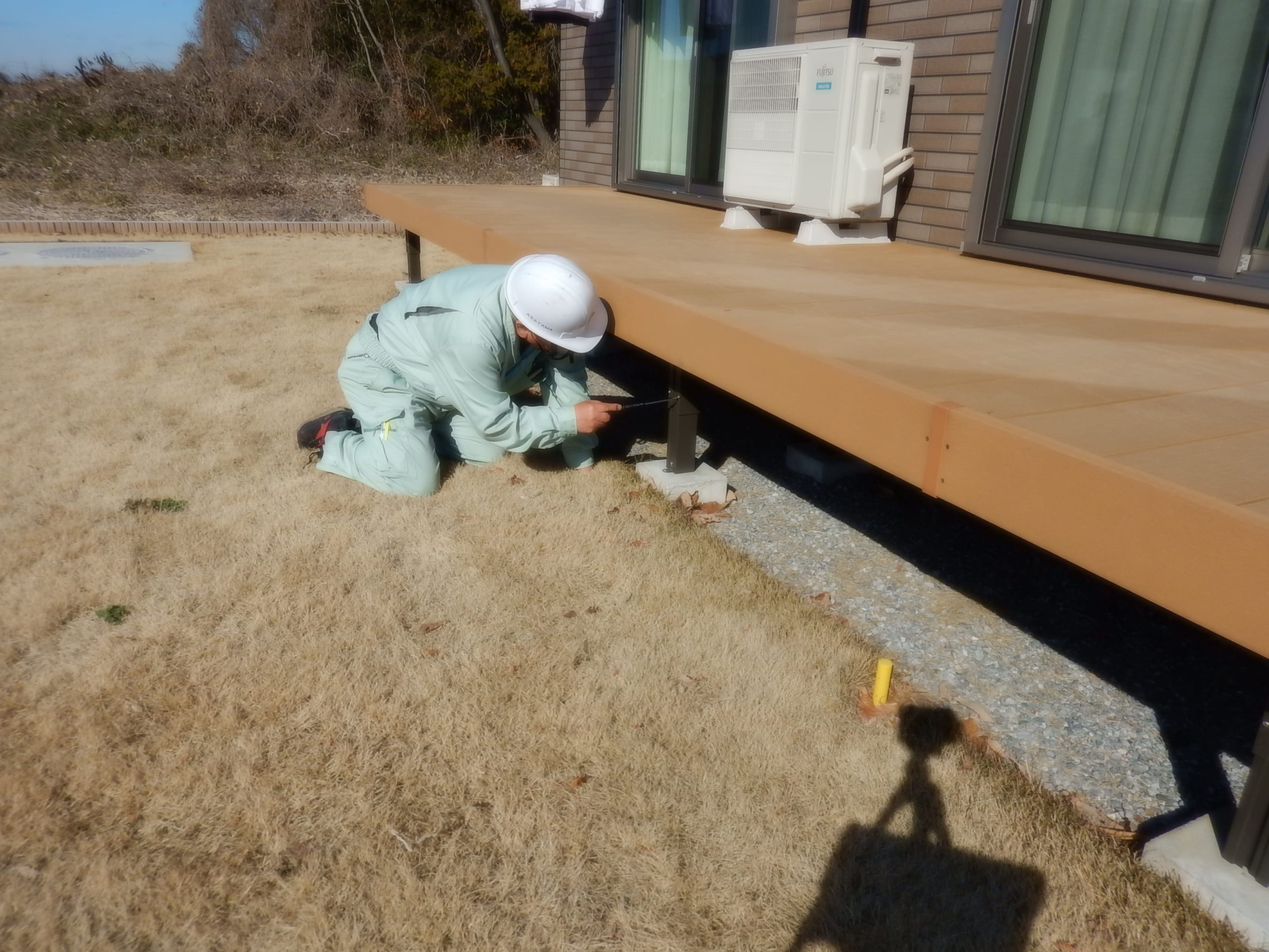 1年点検にお伺い致しました。 ウッドデッキ 極らステージのネジの緩み・歪み等の検査、駐車場コンクリート、縁石、アプローチの打音点検による、ヒビ・割れの検査を行いましたが特に問題ありませんせした。 ただ アプローチの隙間が気になったので、珪砂を入れて来ました。 その他、お客様から、シマトネリコが枯れているとの相談がありましたが、季節的にそういう時期なので、5~6月ごろ新芽が出るときにもう一度確認しますとご連絡致しました。