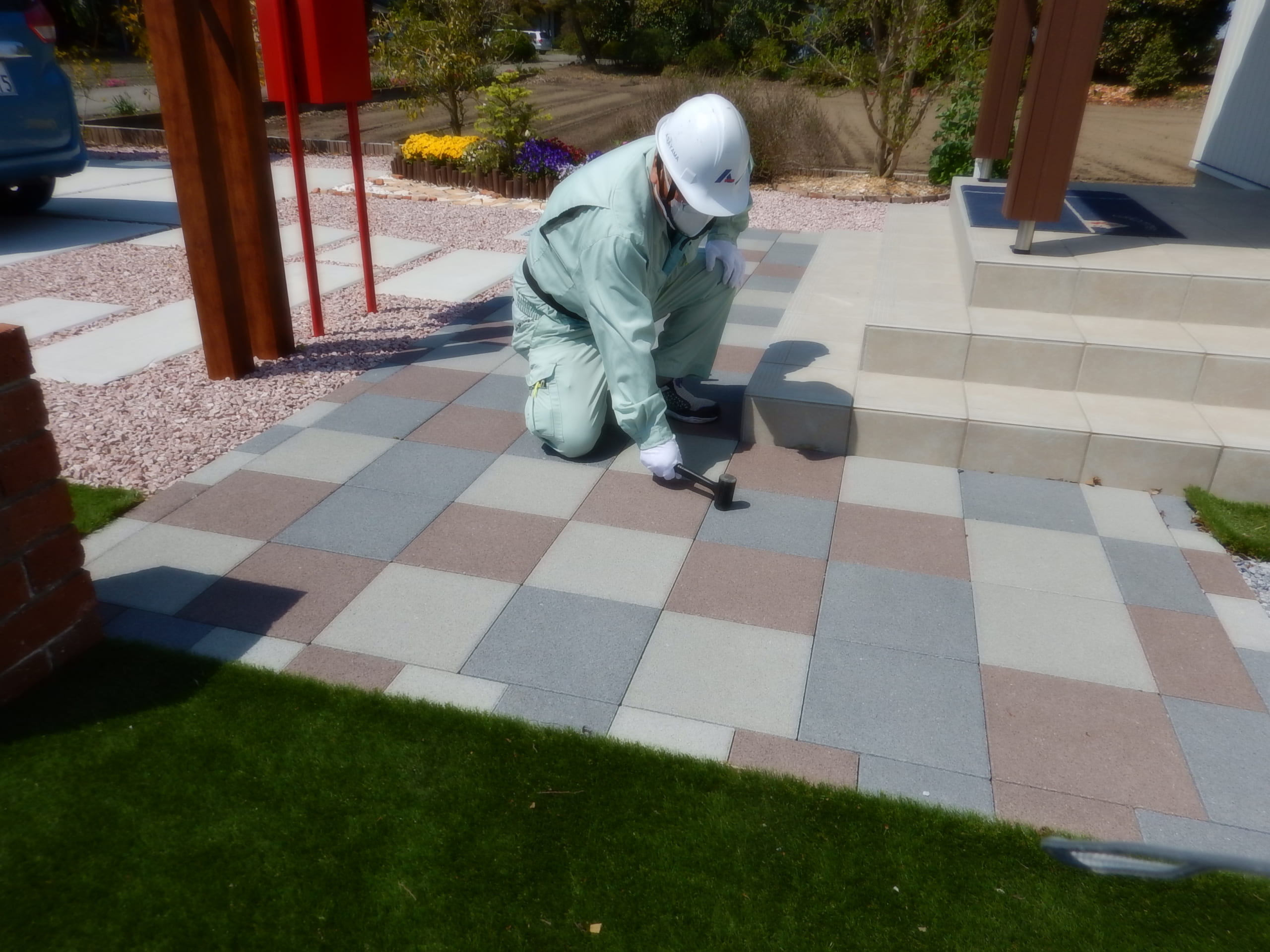 1年点検にお伺い致しました。 駐車場土間コンクリート・縁石・アプローチ・お子様デザイン用コンクリートの打音・ヒビ・割れの検査を行いました。 又 機能門柱・ポストの水平度点検等行いましたが特に問題はありませんせした。 6号砕石+防草シートを確認したところ、防草シートが何個所か捲れていましたので、補修を行いました。その他気付いた点として、アプローチの隙間が少し大きかったので珪砂を入れて来ました。 この日は、珪砂の持ち歩いている量が少し足りなかったので、後日再度行って入れさせて頂きました。