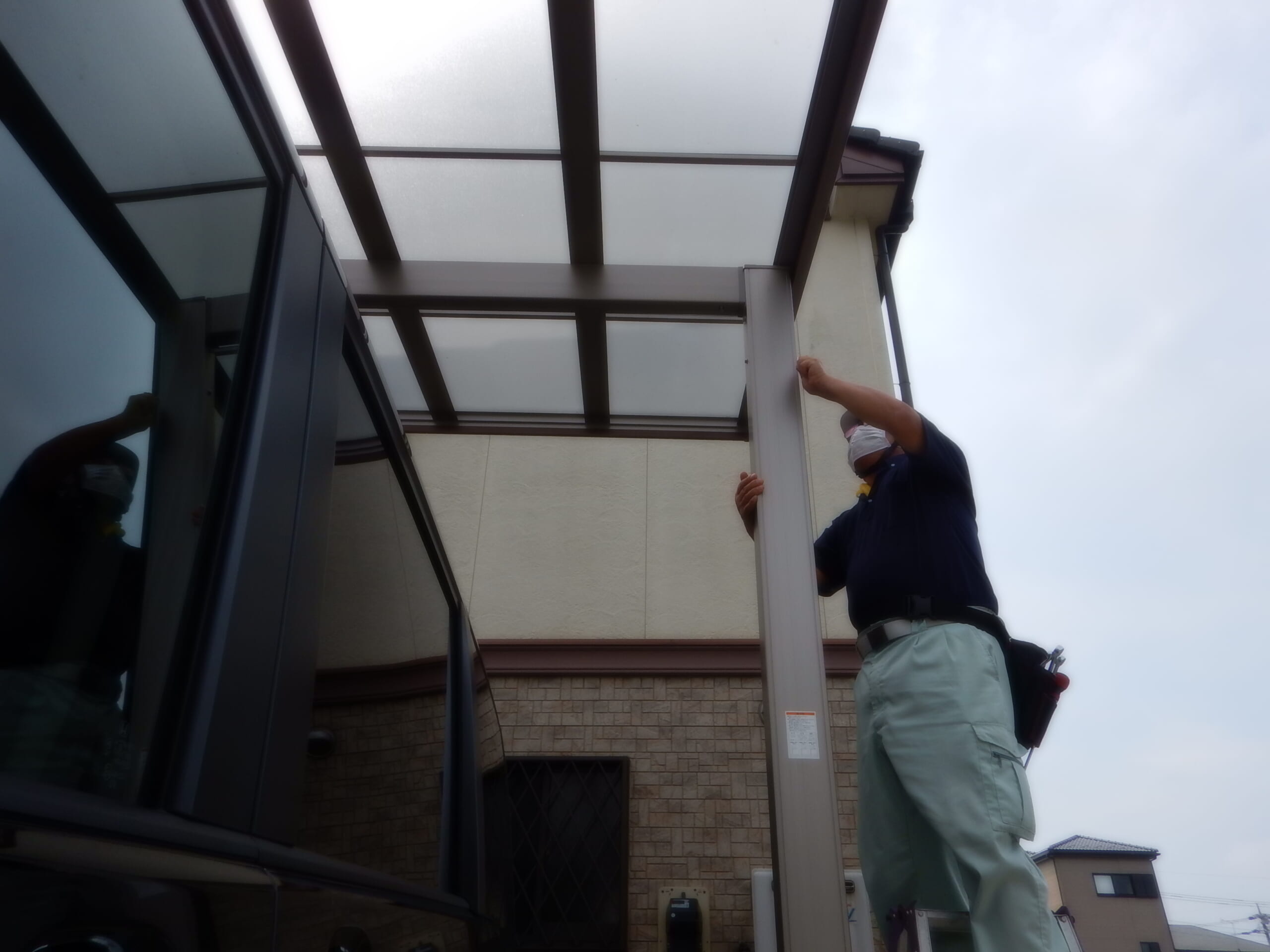 1年点検にお伺い致しました。 駐車場のコンクリート見切り伸縮目地・土留め、アプローチ(平板敷き)のヒビ割れ等 の打音検査、6号砕石+防草シートの捲れや破け、カーポートの取付けネジの増し締め 及び 歪みや変形等の確認検査を行いました。特に問題ありませんせしたが、お客様から相談があり、カーポートの雨どい大雨になると外れ安いとの事でしたので、翌日再度詳細の部品確認に行き、そのあとすぐカーポート雨垂れ補修 (トイへのコーキング再充填) を行いました。 同時にテラス・自転車置き場の工事をした時の概算の金額が知りたいとの事でしたので概算の金額見積りを、ご主人へ提出しました。工事する時はご連絡します・・・とのご回答をもらいアフター1年点検を終了しました。