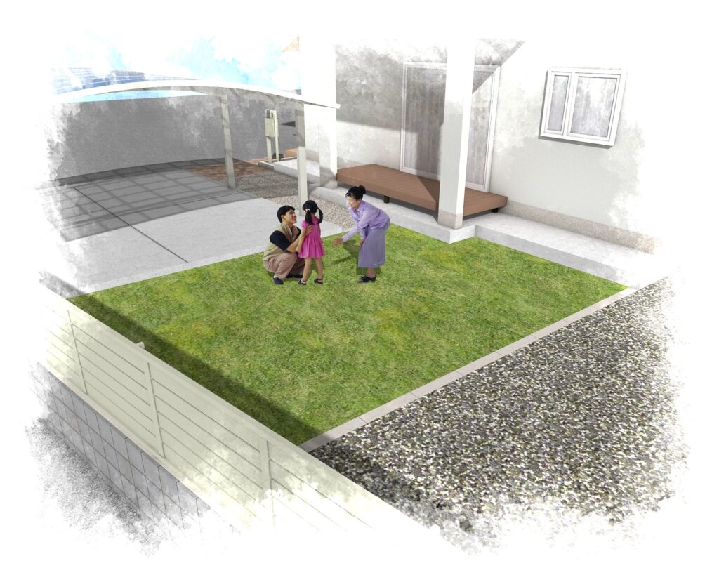 春になったら芝生で遊ぶお子様と、デッキに腰掛けお子様を見守るご家族が