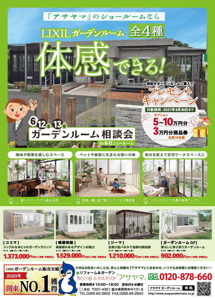 アサヤマショールームではLIXILガーデンルームを全4種「暖蘭物語」「ジーマ」「ココマ」「ガーデンルームGF」を体感頂けます。