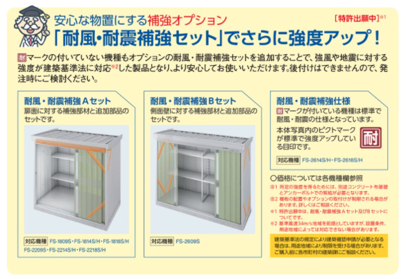 オプションで「耐風・耐震補強セット」を付けることも可能になりました。このオプションを追加することで、強風や地震に対する強度が建築基準法に対応した製品に。収納物を強風や積雪から守り、より安心して使うことができます。そのほか、跳ね返り防止や仮ロック機能など、便利な機能がいっぱい!近年の大型災害にも安心できる、時代が求める最新物置「フォルタ」。気になる方は、お気軽にお問い合わせくださいね。