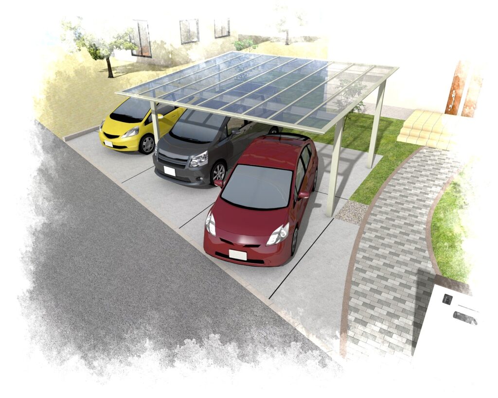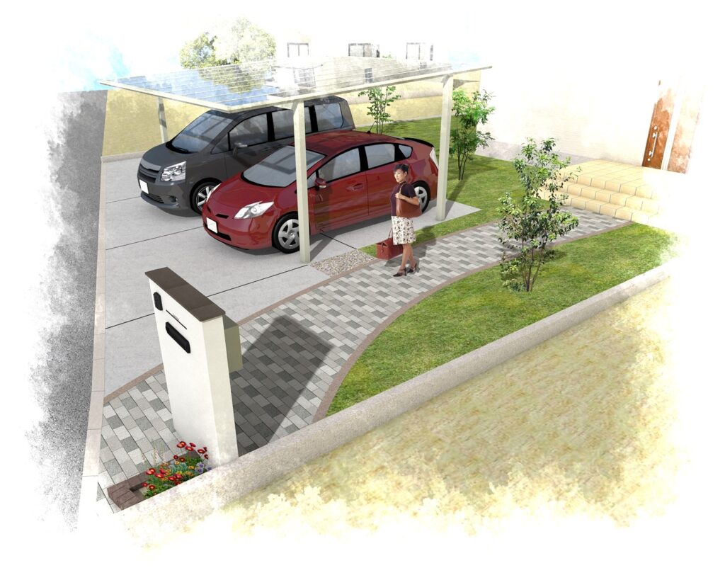 3台分の駐車場コンクリートと2台分のカーポート、アプローチは奥様のご要望でR状に。