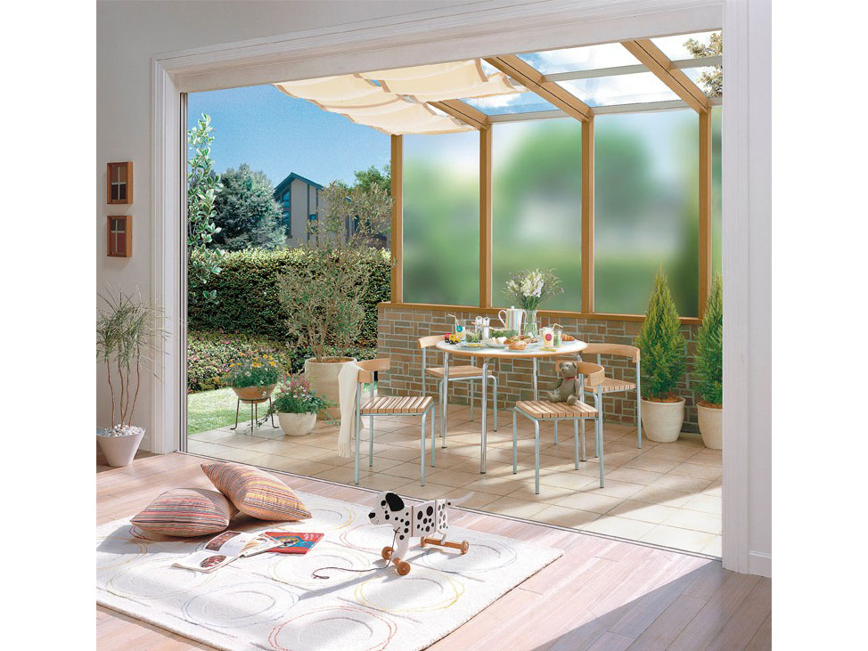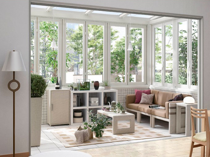 例えば、ガーデンルームのパネルをフルオープンにして風を取り入れたり、フルクローズにしてあたたかい日差しだけを取り込んだり…、季節を問わず自然を楽しむことができます。