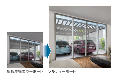 その秘密は、太陽の光を通すポリカーポネート屋根にあります。一般的な折板屋根は日差しを遮り、室内が暗くなってしまいますが、「ソルディーポート」はリビング前に設置しても室内まで日差しを採り込むことができる優れもの。