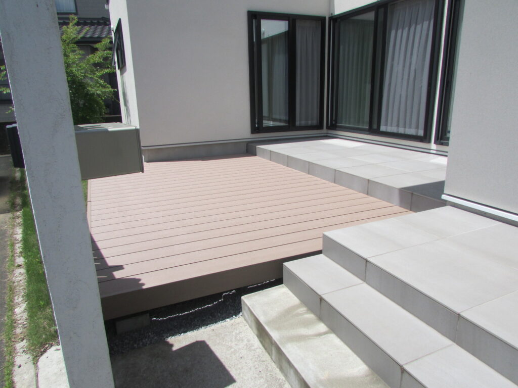 お客様とデッキの高さと位置を現地での打ち合わせ後に作業を開始して既存の芝を剥がしてデッキの下には防草シートと6号砕石が敷き込んであります。