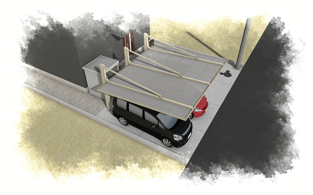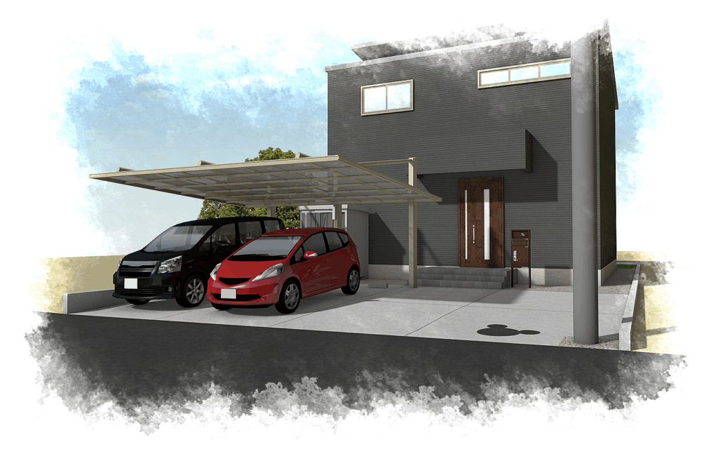 後方にのみ柱があるので、車の出入りの際には柱を気にせずに済みますね。またコンクリートにもデザインを入れました。