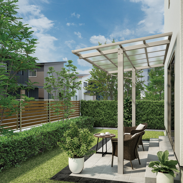 「レセパ」は、設置条件や用途により、LタイプとTタイプの2種類がそろいます。Lタイプは、狭い動線でも柱が邪魔にならない設計なので、勝手口や隣地境界への設置に最適です。Tタイプは、柱が真ん中寄りとなっているため、テラスの柱で前方視界を遮ることがありません。敷地にゆとりがある方におすすめです。開放感あふれる窓辺空間が叶いますよ。