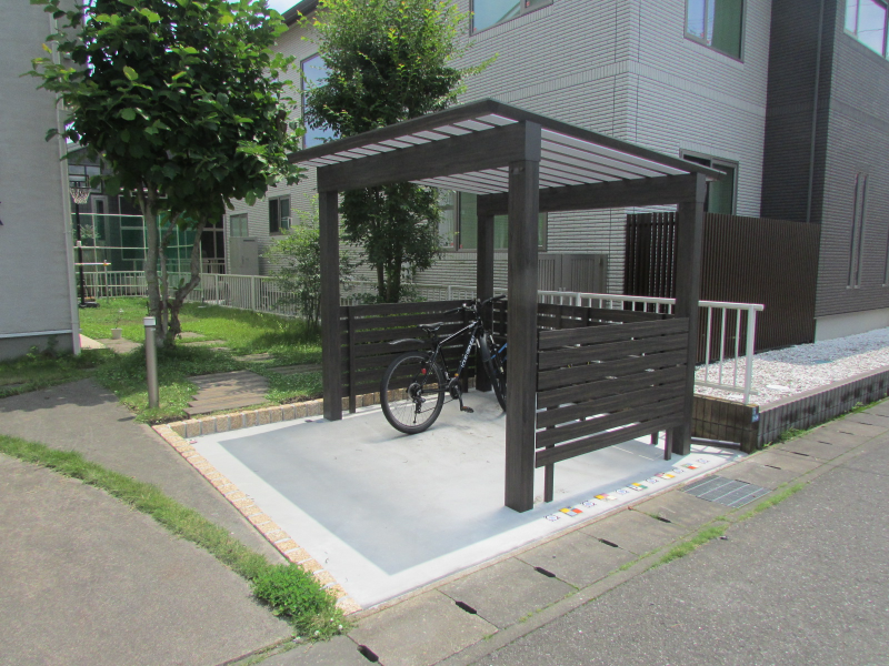 タカショーのおしゃれな自転車置き場に廻りには目隠しを兼ねてフェンスを取り付けてあります。