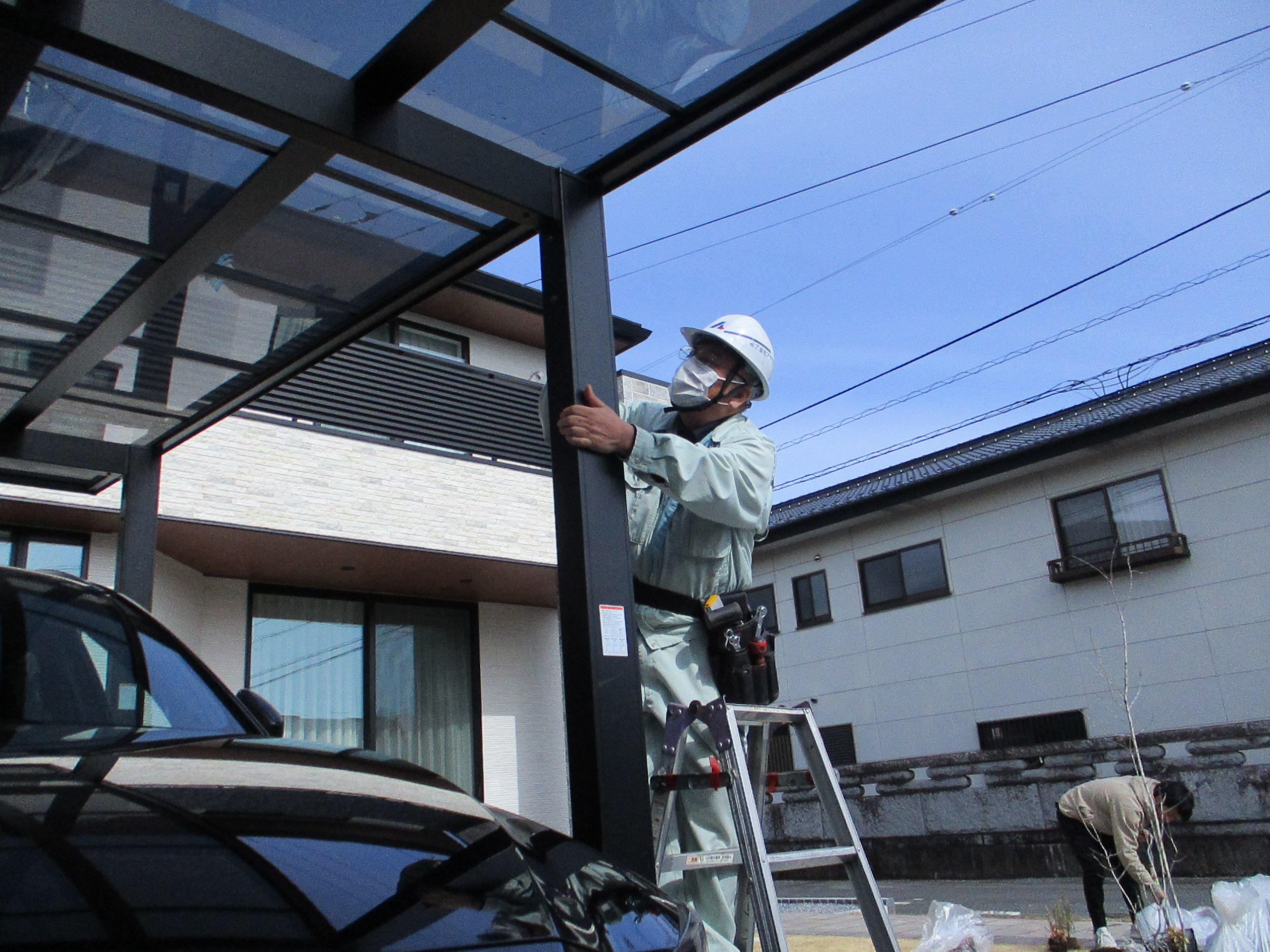 アフター1年点検にお伺い致しました。 カーポート・物置の止めネジを、全箇所増締め及び水平度・変形・歪み等を、確認行いましたが問題は御座いませんでした。 駐車場・見切り・コンクリート縁石・アプローチ・ブロック・門袖等の、打音検査と、ヒビ・目地割れ、変形・歪み等の確認を行いました。 6号砕石 + 防草シートの破れ・捲れ等を確認致しましたが問題ありませんでした。 次に天然芝生の枯れ・色具合等の確認行いましたが、成長に問題ありませんでした。 芝生が元気よく、アプローチの中まで侵入してきているので、ご主人と芝生のお手入れについて少しお話させてもらいました。 その他、目視検査結果特に問題ありませんせした。