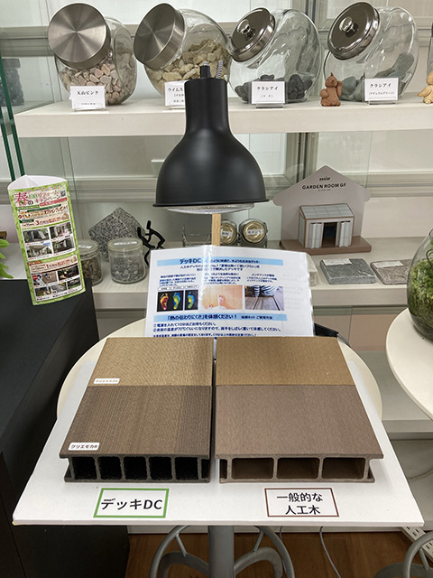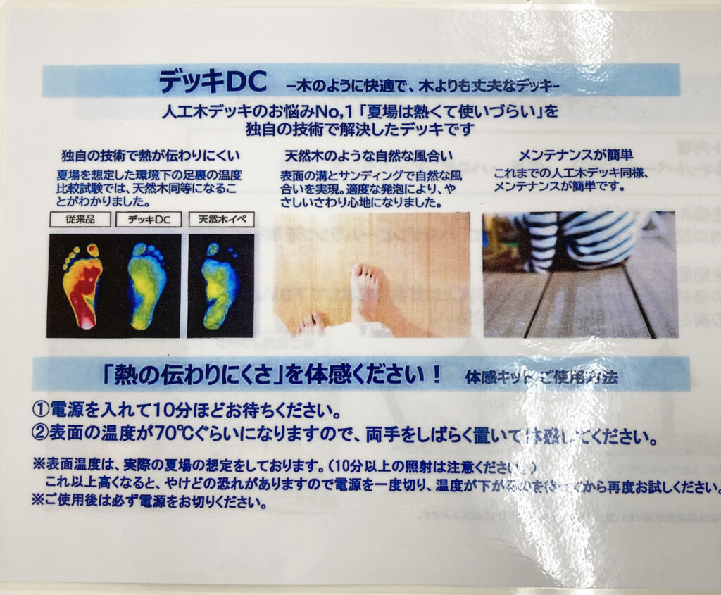 真岡市の本社ショールームでは、一般的な人工木とデッキDCの温度の違いを実際に体感できます。