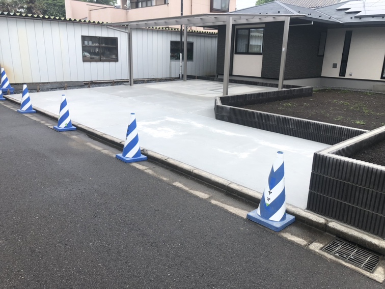 駐車場の土間コンクリートの養生となります。明日は芝張り作業の予定となります。