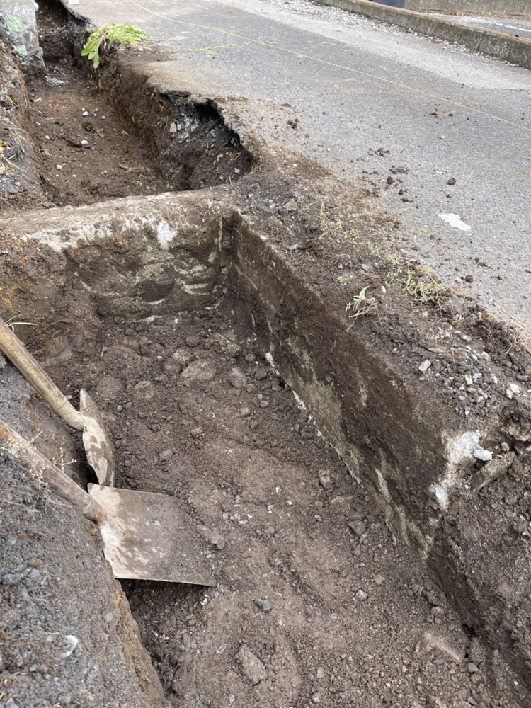 ブロック部分の掘削中に既存の基礎が出て参りました。これより解体撤去作業の開始です。 | ホームエクステリア『アサヤマ』