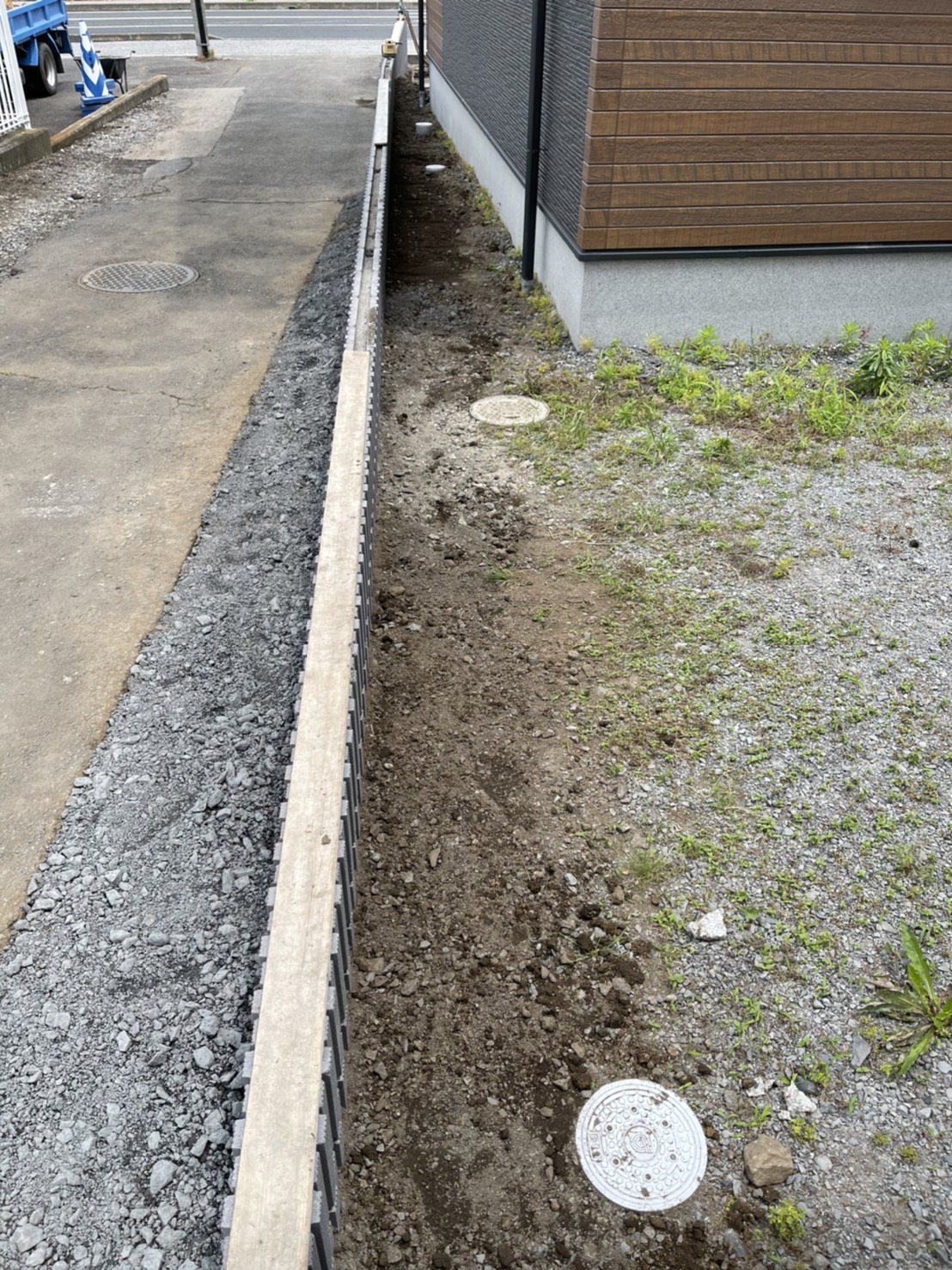 外構工事作業中ですが本日はお客様のお引越しとなります。搬入通路を確保してお車の出入りの準備完了です。