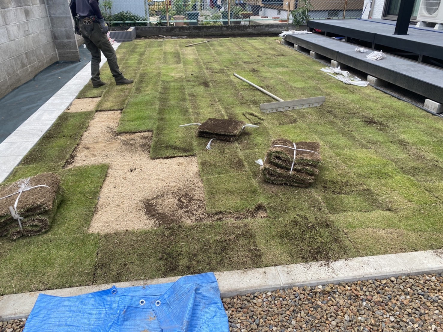 植栽作業となります。芝張り作業の方も本日で完了となります。