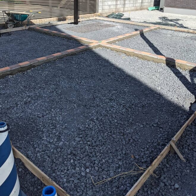外構ING  駐車場コンクリートの見切りインターロッキング施工です。