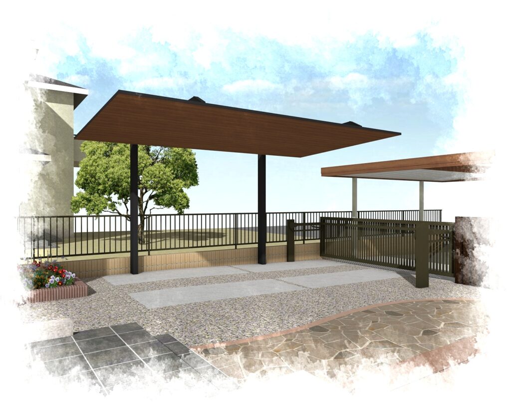 今回は木目調のカーポートSCと、お庭の天然石の舗装です。