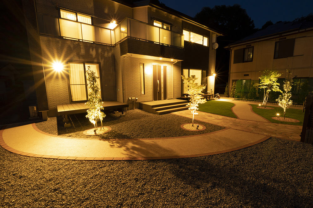 建物やフェンスをライトアップしたり、庭の植栽にスポットライトを当てたり。