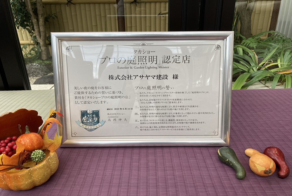 タカショーのライティングマスターも在籍していますので、何でもご相談くださお庭の照明計画は、アサヤマにお任せを!
