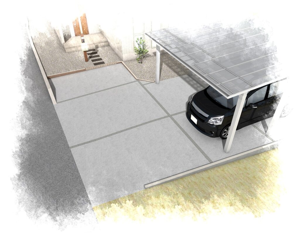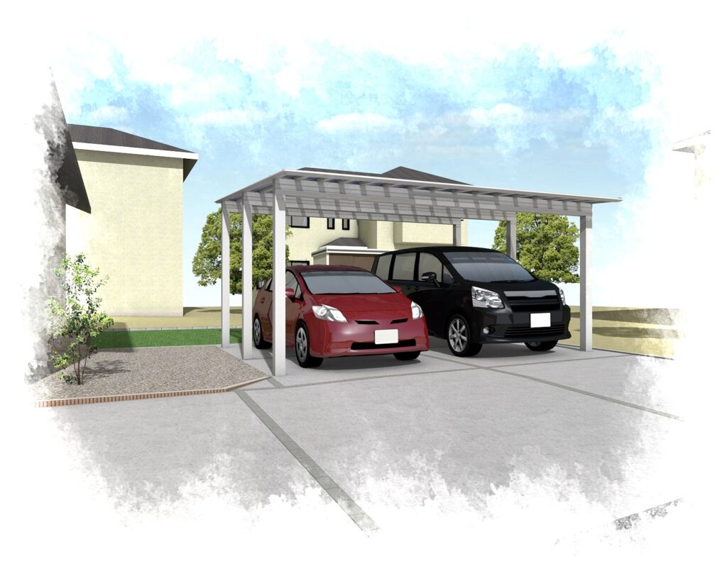 駐車場にはカーポート、お庭は人工芝を施工します。