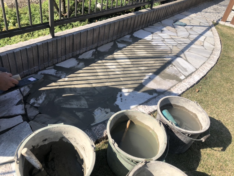 自然石の乱張りの目地入れ作業です。