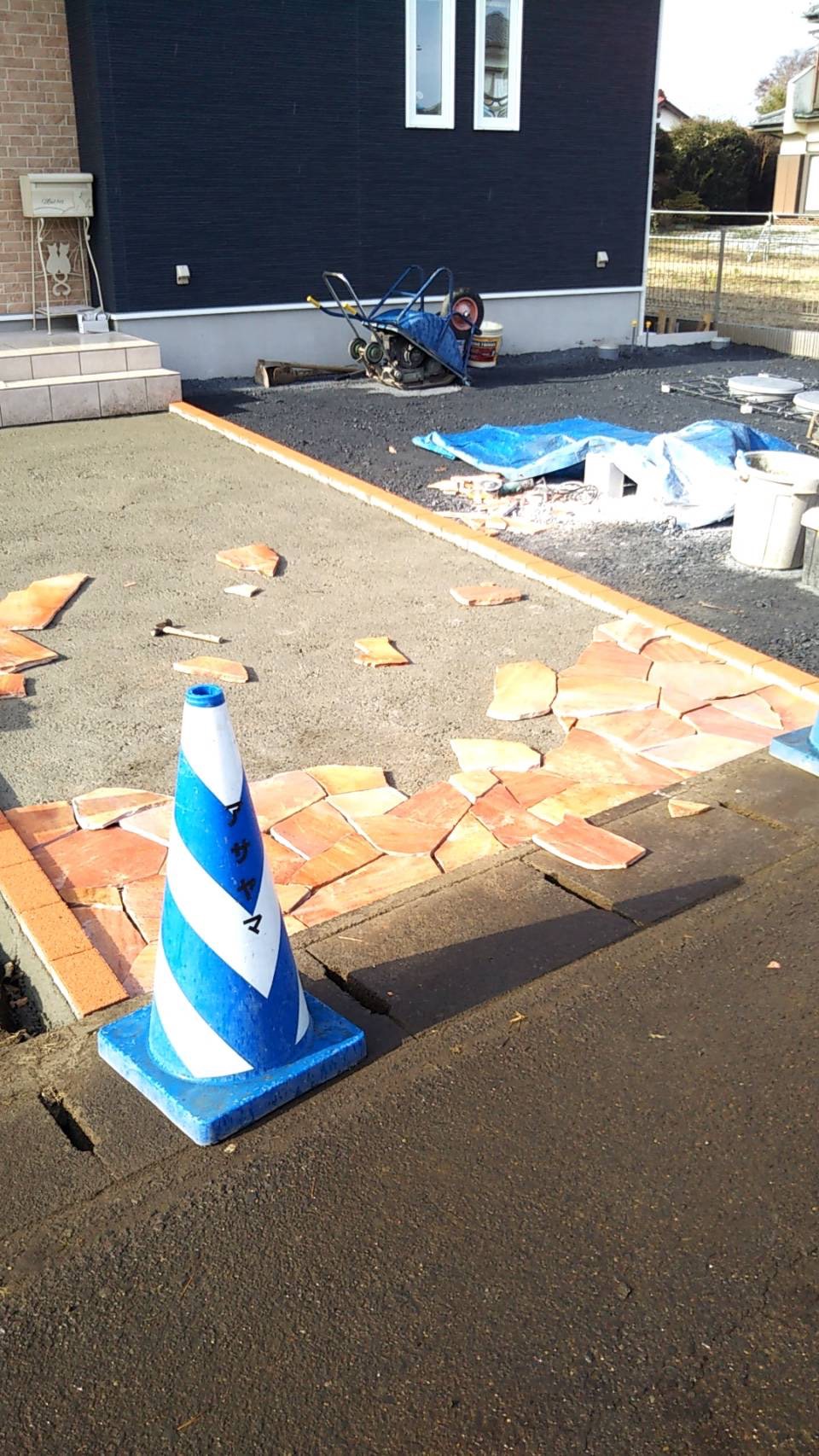 アプローチの天然石貼り作業です。