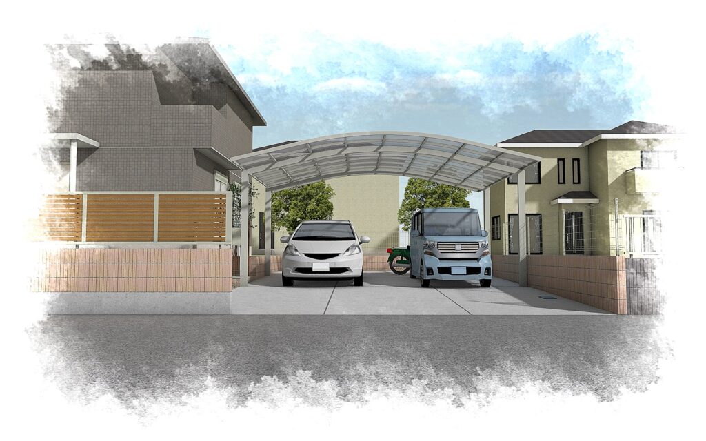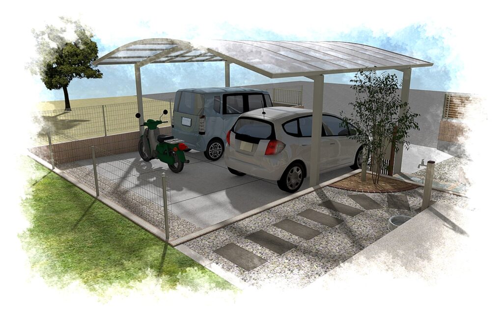 自動車と、バイクが置けるよう通常サイズよりも大きめのカーポートを設置を致します。
