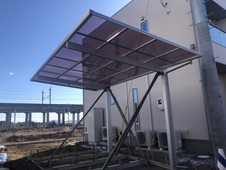本日はお客様の家具家電の搬入となりますがようカーポートの屋根張り作業完了です。