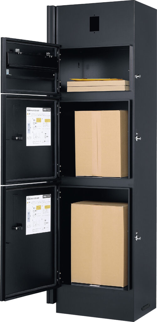 サイズが異なる2つの宅配ボックス(上段100サイズ・下段110サイズ)を設置し、一度に2度荷物を受け取れるようにしています。