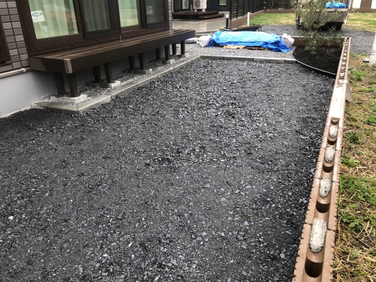 お庭の人工芝張りの下地まで完了となります。来週いよいよお庭へ人工芝張り作業へ参ります。