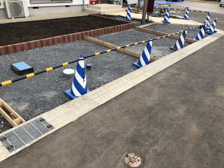 外構ING  型枠組み作業も終わり今週末には駐車場の土間コンクリートの打設作業となります。
