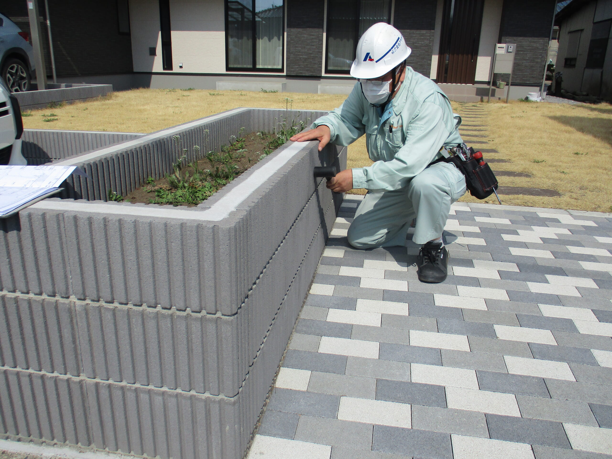 アフター1年点検にお伺い致しました。 カーポート の、止めネジを全箇所増し締め行いました。 門柱・枕木・表札・ ポスト の 水平度確認しましたが特に問題ありませんでした。 土間コンクリート ・ コンクリート縁石― ・土留め ・伸縮目地 ・見切り ・ アプローチ・枕木風平板 の打音検査による 割れ・変形・歪み等の確認を行いましたが特に問題ありませんせした。 6号砕石 + 防草シートの敗れ・捲れ等はありませんでした。 芝の成長は、特に問題ありませんでした。 その他、点検結果 特に問題ありませんでした。 『 春のガーデン & エクステリアフェア 』 のチラシをご主人に手渡させて戴きました。