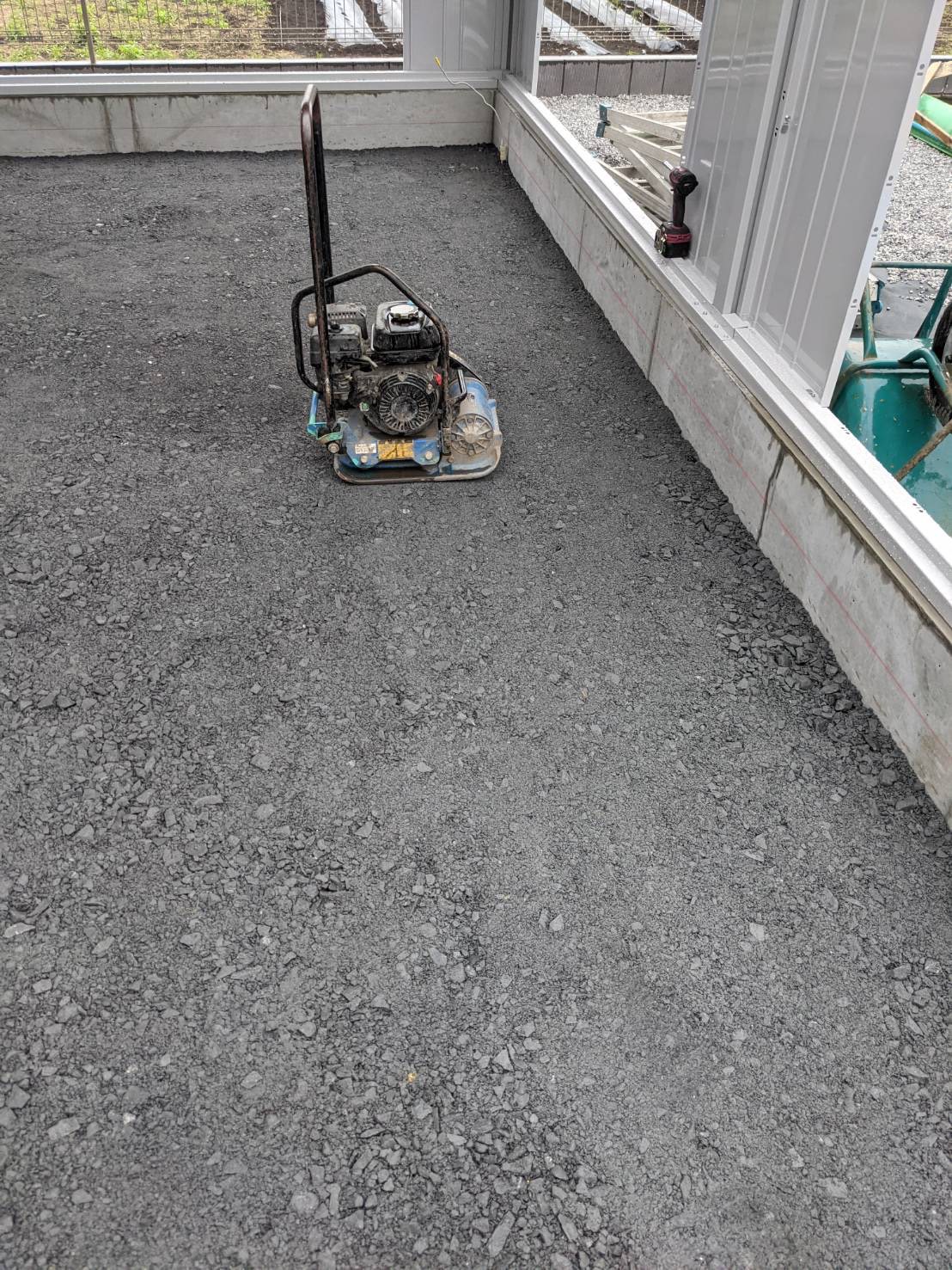 ガレージ内コンクリート下地砕石の転圧です