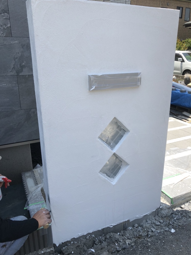 外構ING  門袖のビブロ塗り作業となります。