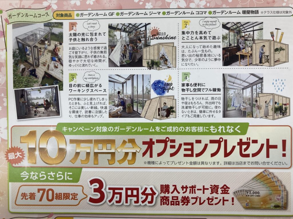 オプション10万円分や購入サポート資金プレゼント、そしてガーデンルームが定価の40%offでお買い求めいただける大変お得なチャンスですので、ガーデンルームをご検討中のお客様、お早めにご相談ください。