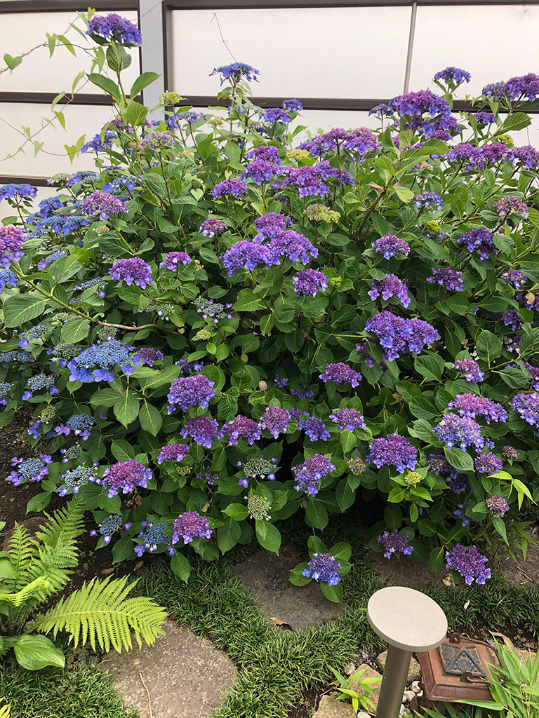 真岡の本社ショールームでも青と紫色のあじさいが花を咲かせています。