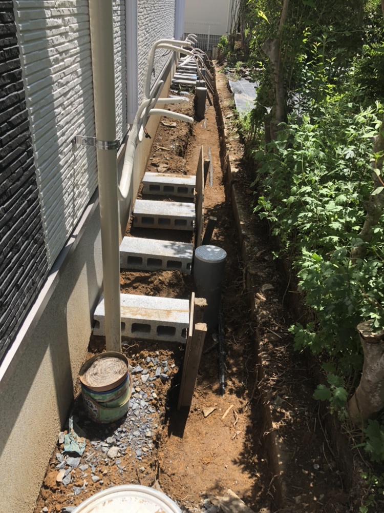 北側境界部分のブロック作業の為のエアコン室外機の移動となります。