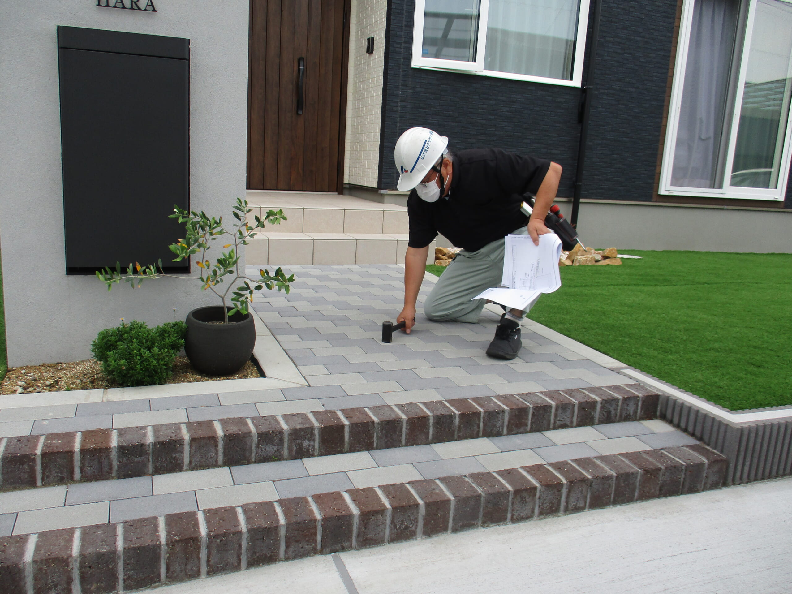 アフター1年点検にお伺い致しました。 カーポート & サイクルポート の、止めネジを全箇所増し締めの確認を致しました。 門柱・表札・ポスト・物置 の 水平度の確認を行いしました。 土間コンクリート・コンクリート縁石・土留め・伸縮目地・アプローチ・ステップ蹴り上げの打音検査と、ヒビ・目地割れ、変形・歪み等の確認を行いましたが特に問題ありませんでした。 6号砕石 + 防草シートの敗れ・捲れ等はありませんでした。 その他、点検結果 特に問題ありませんでした。 奥様が対応してくれました。 アプローチの隙間が少し大きかったので、珪砂を入れて来ました。