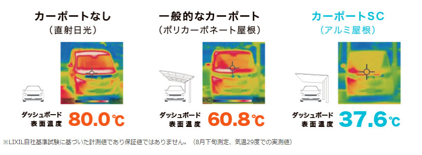 「カーポートなし」と比較して、ダッシュボードの表面温度が約42℃低い結果になったそうです。
