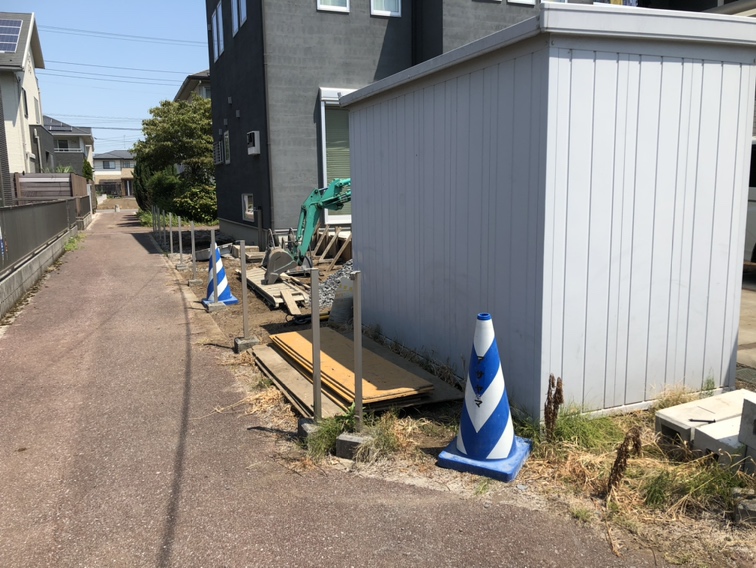 既存境界のフェンスを外して建物廻りのスキトリ作業となります。