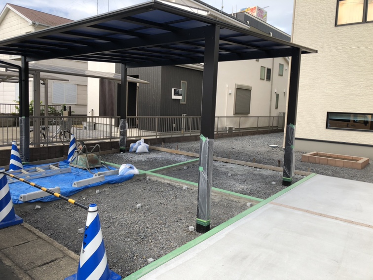 外構ING  本日は駐車場の土間コンクリートの打設予定でしたが台風のの影響により雨予報となりコンクリートの打設作業は延期と致しました。