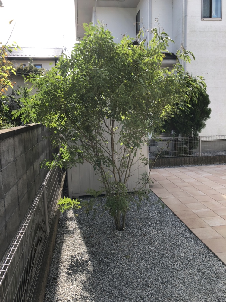 玄関前よりお庭へシマトネリコの移植作業完了です