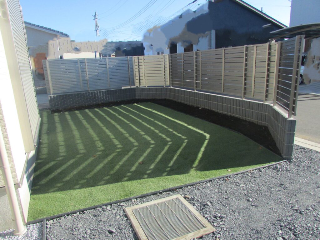 お庭は人工芝を施工しました。お庭スペースが道路に面した位置にありますが、目隠しフェンスを施工したため安心して過ごす事ができます。