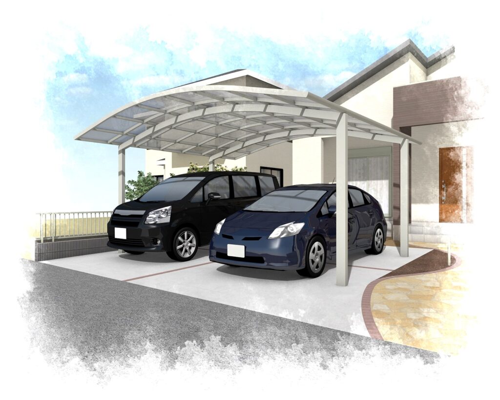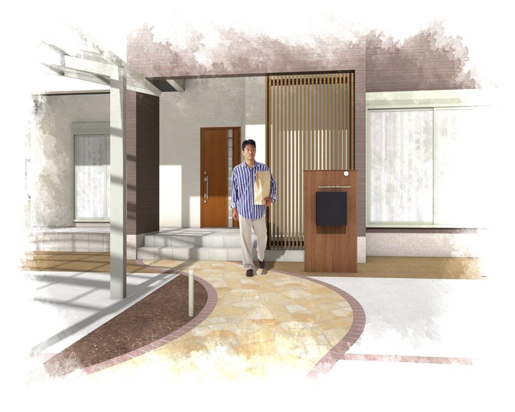 天然石乱張りのアプローチのRとカーポートのR屋根が優しい印象です。