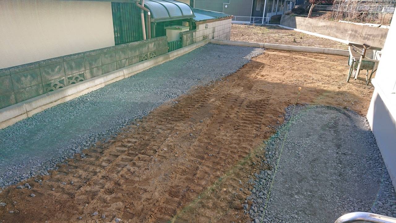 人工芝下地、犬走り下地砕石入れです。