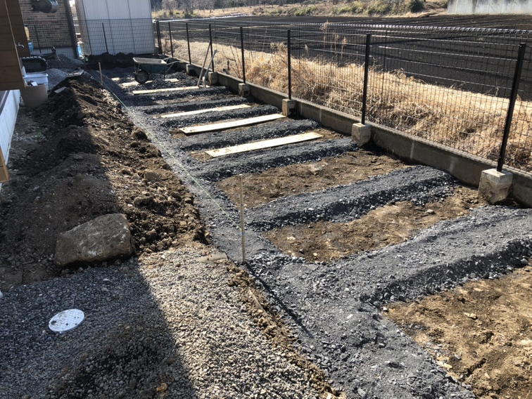 ブロック部分への砕石入れ作業となります。